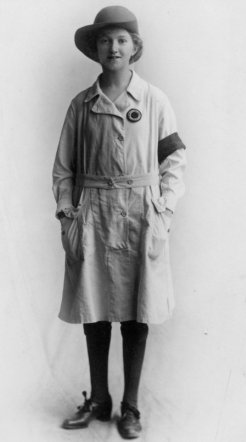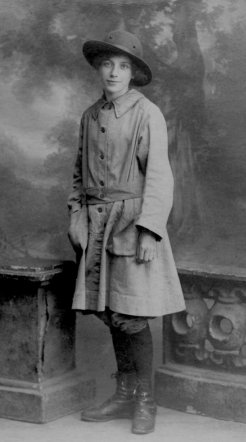 Photographs of First World War Land Army girls can be distinguished from those of the Second World war by the overall they wore. The "cowcoat" style overall usually has a cloth belt with two buttons similar to many munition worker's tunics. Usually made from white material for girls mainly employed in dairy work or beige if the woman was employed on more general farm duties.